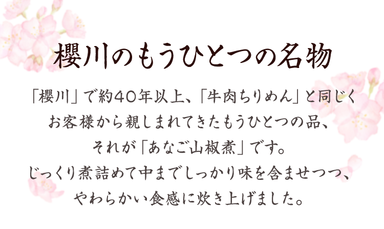 明石産の穴子を丁寧に白焼きし穴子の臭みを取り除き、甘味料は一切使用せず、たっぷりの日本酒と溜まり醤油を使い炊き上げました。温かいご飯に乗せて頂くと、穴子の脂と醤油が溶けだし実山椒の風味と爽やかさがご飯のお供に最高です。